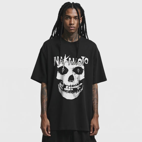 The Nakamoto Skull design fuses underground punk attitude with Bitcoin’s rebel energy, a nod to The Misfits’ iconic skull, re-imagined for the digital age.