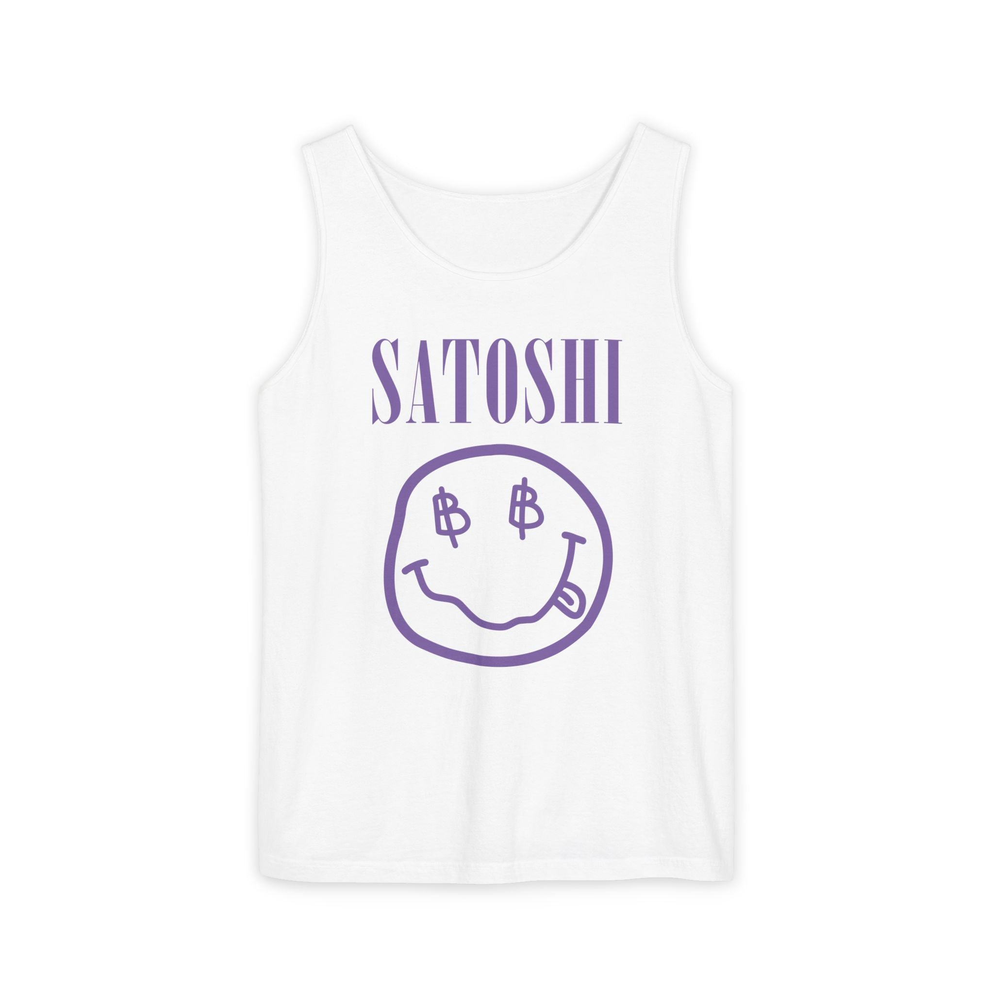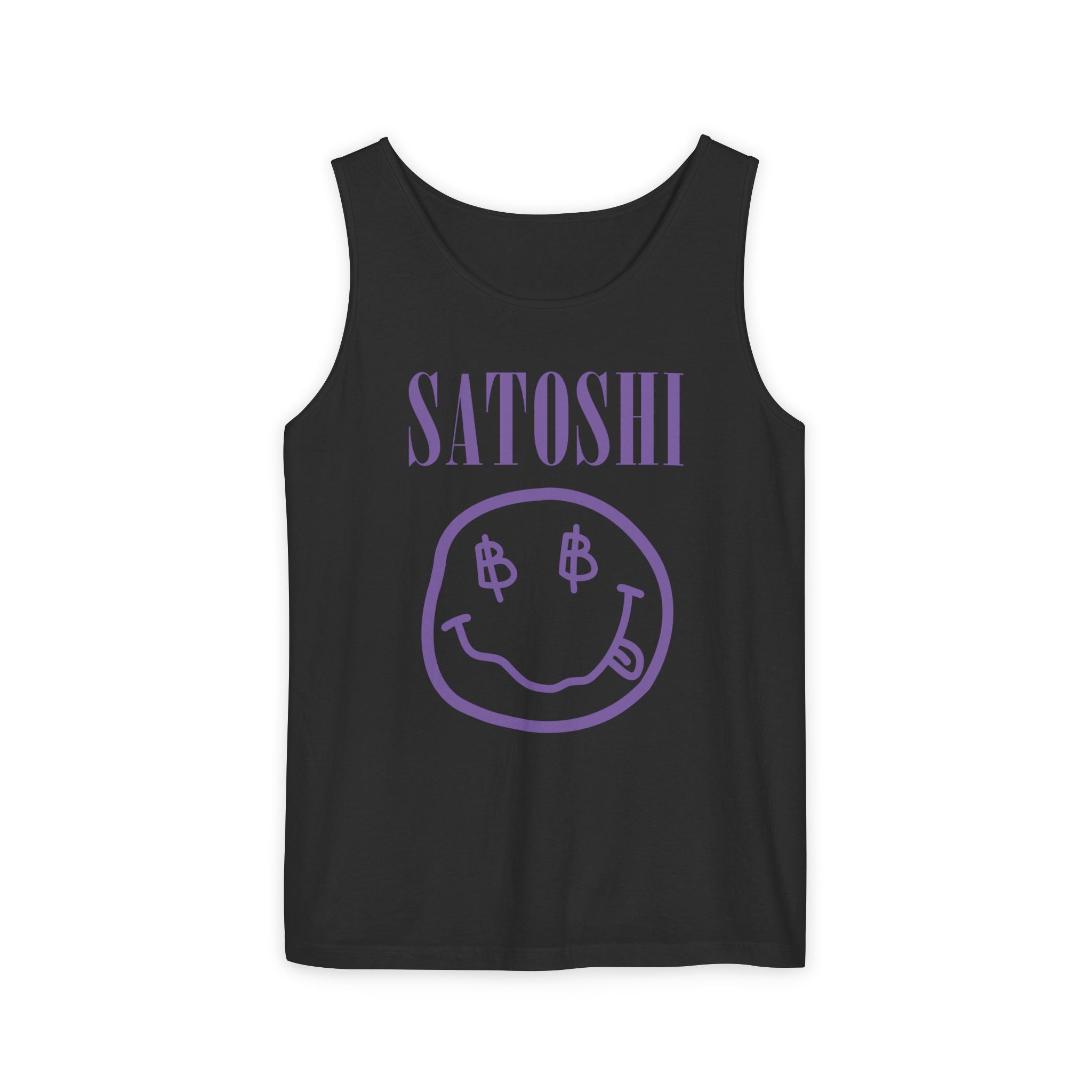 A fun Nirvana-inspired classic Bitcoin tank top featuring a retro smiley doodle like the ones Kurt Cobain used to sketch. Bold, minimalist, and perfect for Bitcoin fans who love a grunge twist.